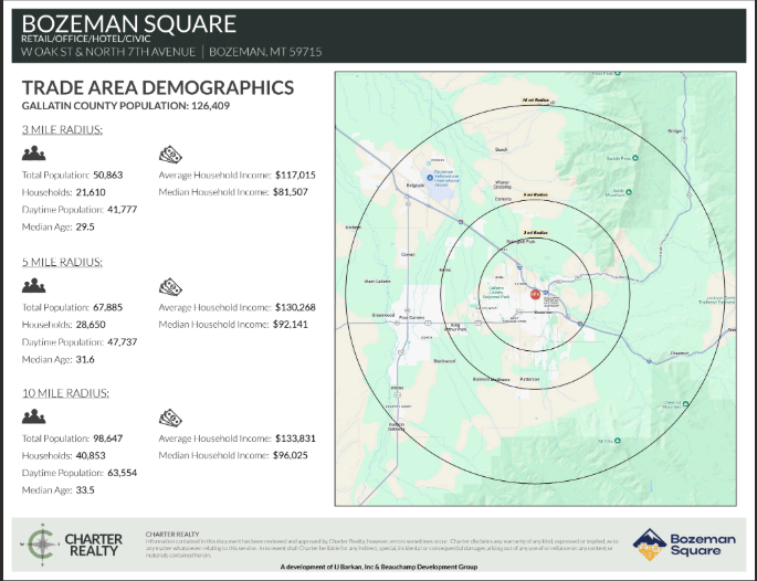 Located just south of an Interstate-90 interchange, a mile north of downtown Bozeman’s Main Street and between 19th Ave, Bozeman’s box retail corridor, and the gentrifying Northeast neighborhood, Bozeman Town Center is truly an “infill” location. Bozeman Town Center benefits from the real estate fundamentals of 19th Avenue with the allure of Main Street, but with convenient parking, in a location that will appeal to residents and visitors alike.